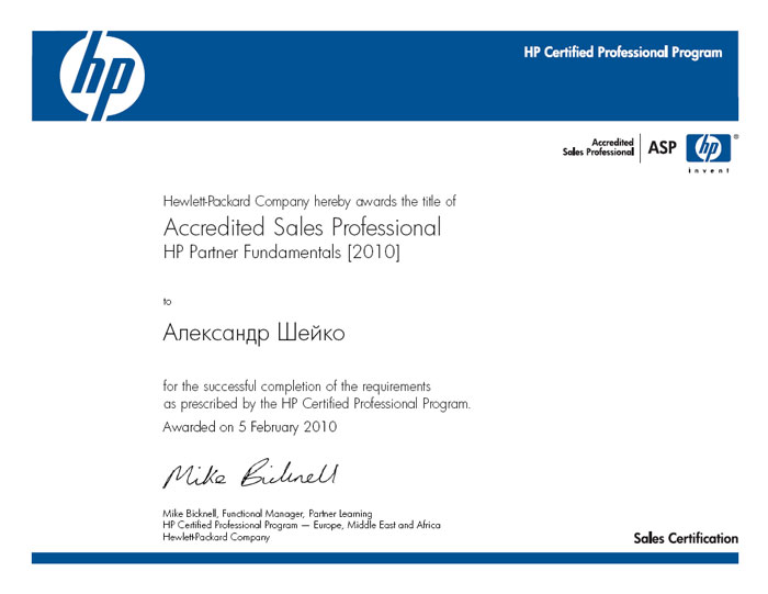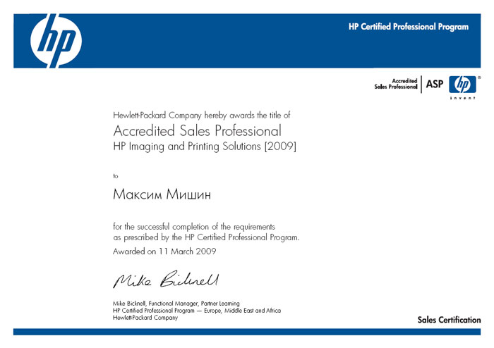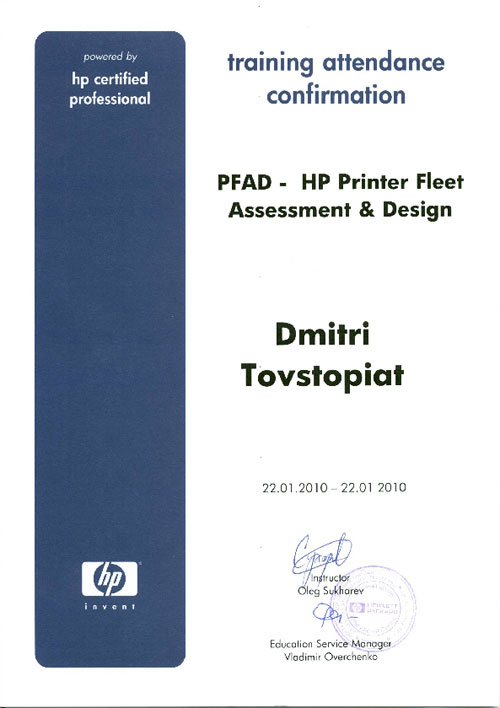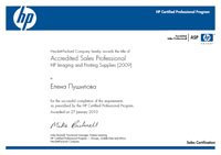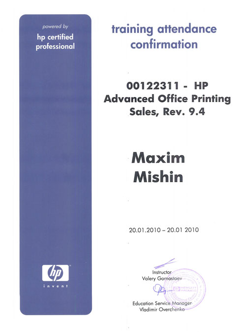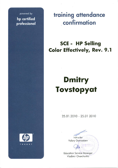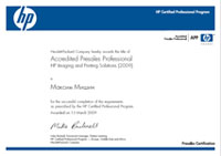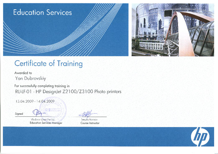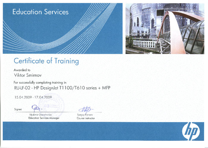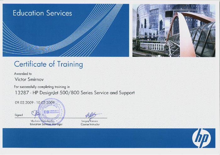 Менеджеры компании Графических технологий постоянно повышают свою квалификацию, чтобы быть в курсе всех новых технологий. Мы гарантируем вам предоставление высокого качества обслуживания и технической экспертизы. Здесь вы можете ознакомиться с компетенциями, которые получили наши менеджеры на специализированных семинарах и тренингах. Ниже приведены официальные сертификаты мирового протзводителя Hewlett-Packard.