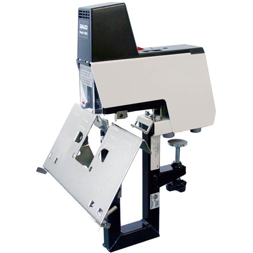 Узкий электрический степлер для офиса и скрепления упаковки. Два или больше степлера могут быть соединены последовательно волоконно оптическим кабелем для скрепления одновременно. Степлеры соединены последовательно и поэтому не дают перегрузку на линию. Запатентованное электронное управление, пневматическое демпфирование делает скрепление простым и приятным. Сшивание происходит автоматически или с помощью педали. Защитный козырек обеспечивает дополнительную безопасность.
